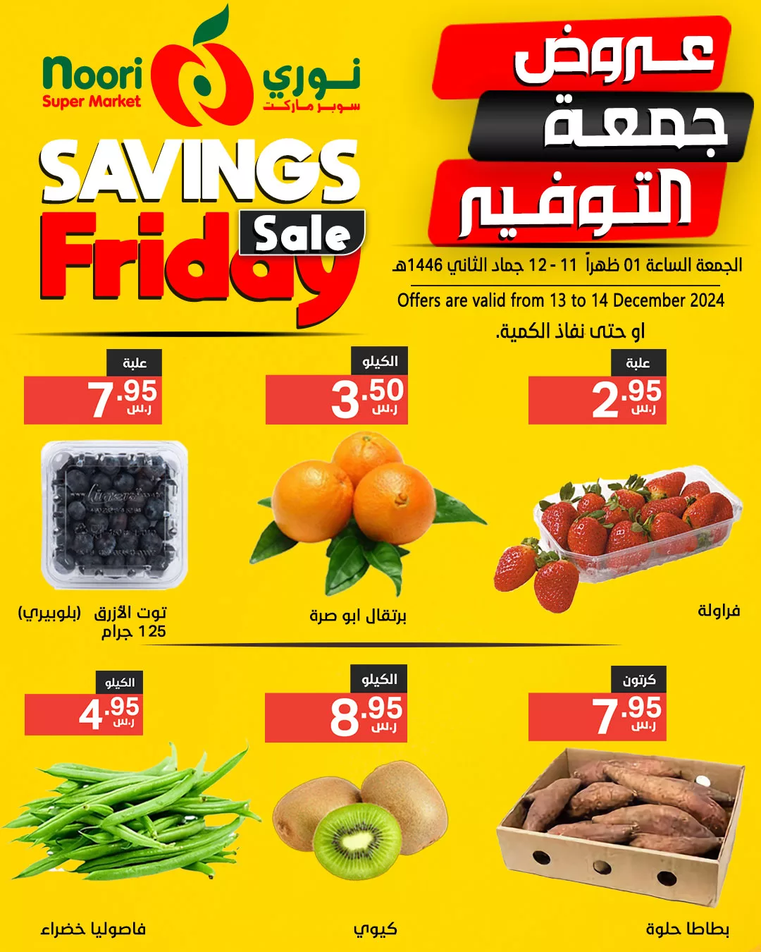 عروض نوري هايبر ماركت الجمعة 13 ديسمبر 2024 تقدم لعملائها تخفيضات مميزة على مختلف المنتجات التي تلبي كافة الاحتياجات و تشمل العروض السلع التموينية مثل الأرز و السكر والزيوت بالإضافة إلى خصومات على اللحوم الطازجة والدواجن كما تتوفر عروض خاصة على الخضروات والفواكه الطازجة بأسعار تنافسية.