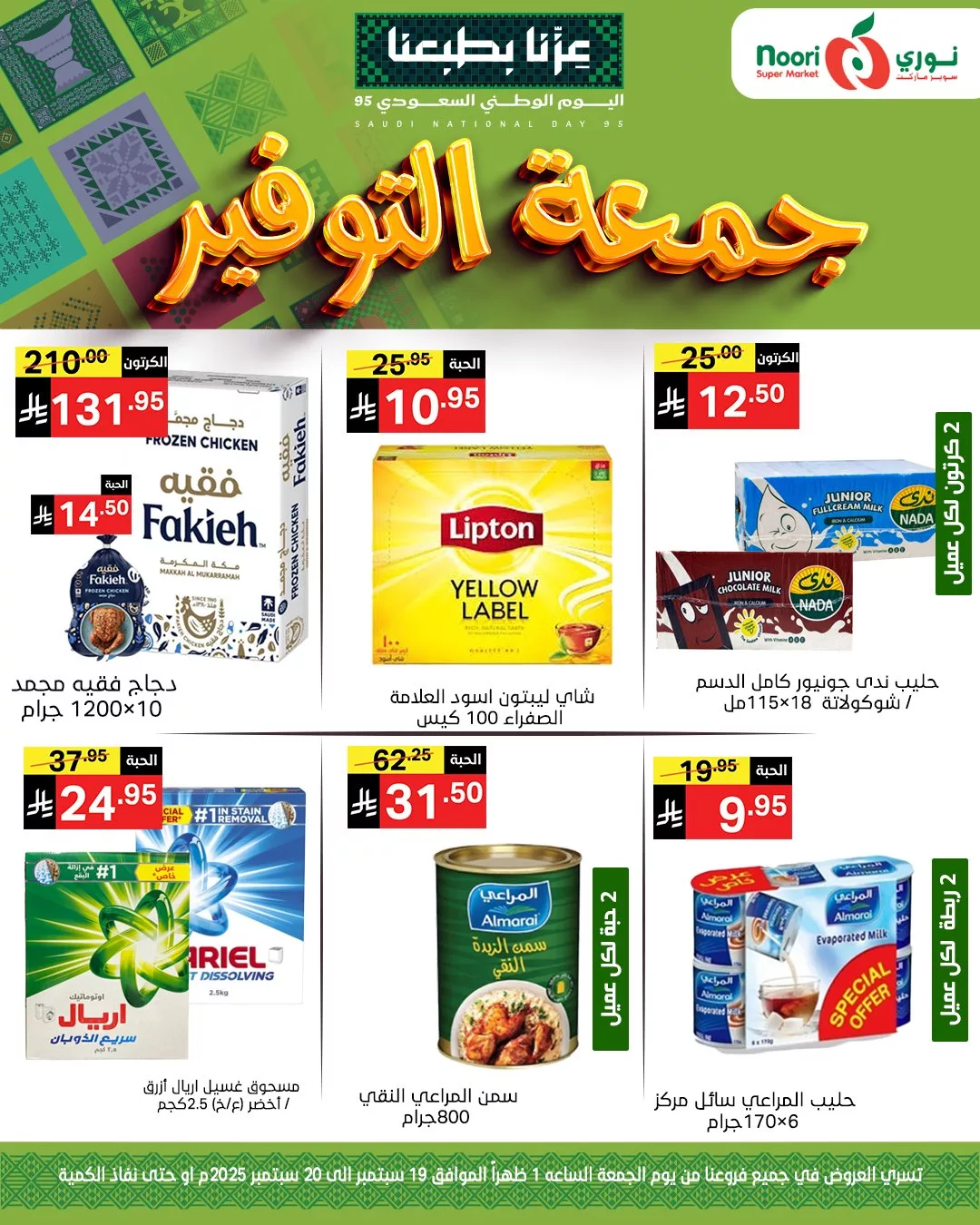 عروض نوري هايبر ماركت الجمعة 19 سبتمبر 2025 تقدم تخفيضات على منتجات البقالة الأساسية و تشمل منتجات اللحوم والدواجن مثل دجاج فقيه مجمد بالإضافة إلى المشروبات ومسحوق كاكاو بانو وكذلك منتجات الألبان كما تتضمن منتجات البسكويت والحلويات و منتجات النظافة والمنزلية وغيرها من المنتجات و باقل الاسعار