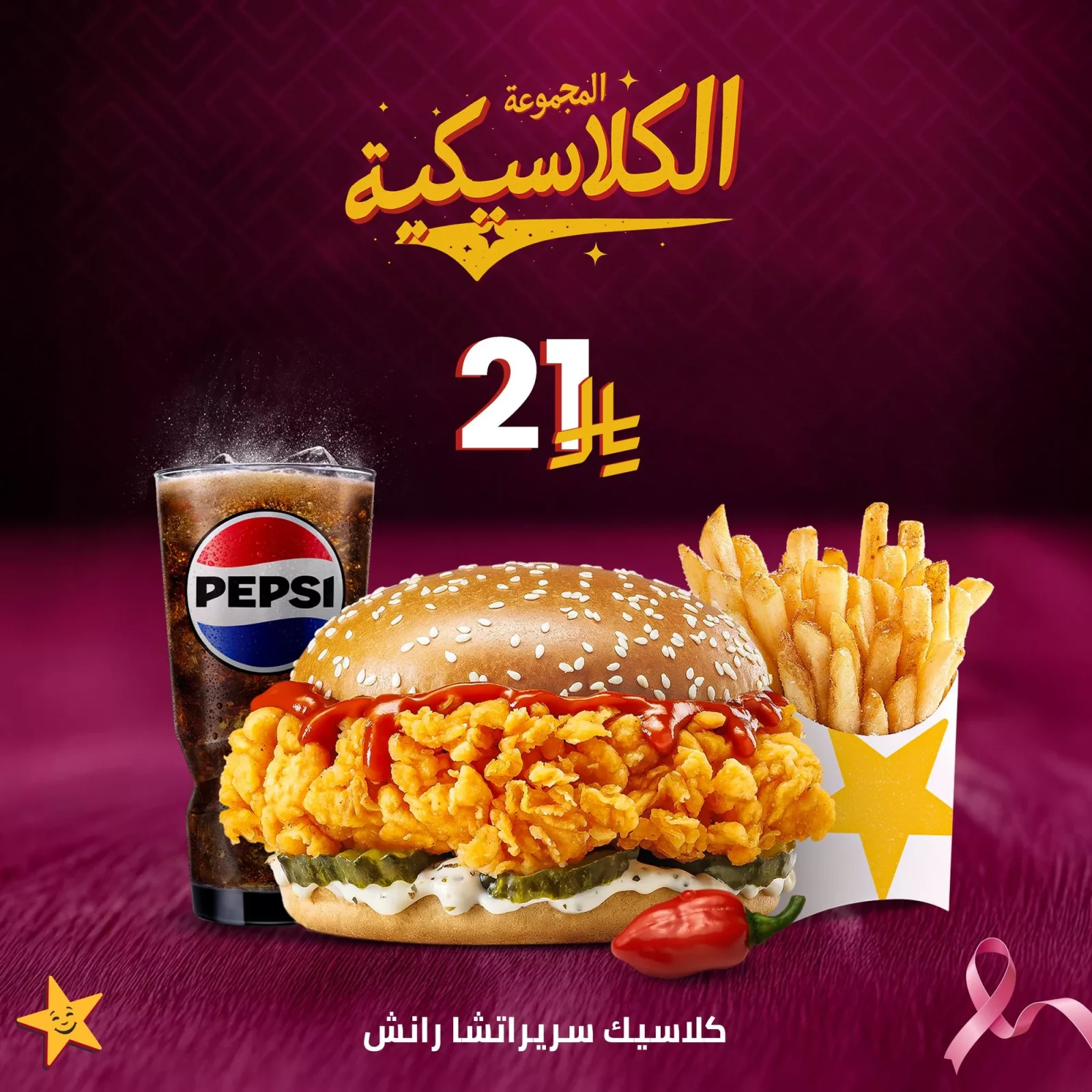 - تقدم لكم هارديز السعودية عرض علة المجموعة الكلاسيكية شاملة برجر و بطاطا و مشروب كلاسيك سريراتشا رانش