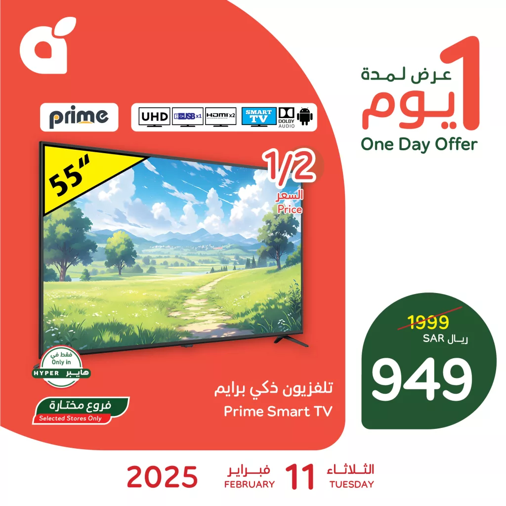 ما زلنا نواصل معكم التغطية الصباحة لكافة العروض اليومية من الاسواق والهايبرماركت فى السعودية ومع عروض بنده الصباحية ليوم الثلاثاء هل تبحث عن تلفزيون ذكي بجودة عالية وسعر لا يُقاوم 🤩 لا تفوت الفرصة تقدم هايبر بنده عرضًا استثنائيًا ليوم واحد فقط على تلفزيون برايم الذكي 55 بوصة حيث يمكنك الحصول عليه بنصف السعر