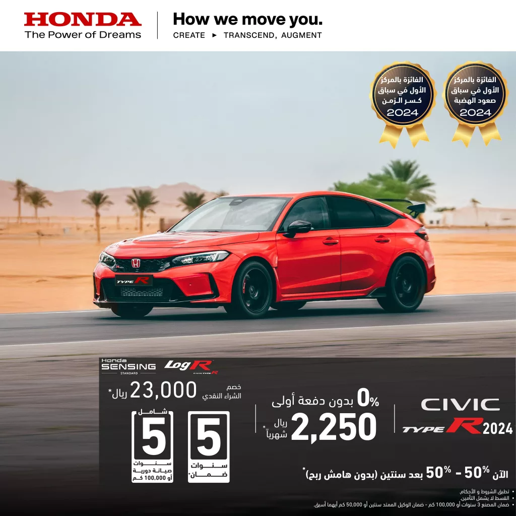 عروض هوندا على سيارات الدفع الرباعي والسيارات الرياضية تقدم للعملاء خيارات تقسيط بدون دفعة أولى وفائدة صفرية مع ضمان يصل إلى 5 سنوات وصيانة مجانية و تضمن هذه العروض تجربة قيادة مريحة وخالية من المتاعب و السيارة هوندا سيفيك Type R تعتبر واحدة من أقوى السيارات في فئتها بفوزها بجوائز متعددة لعام 2024