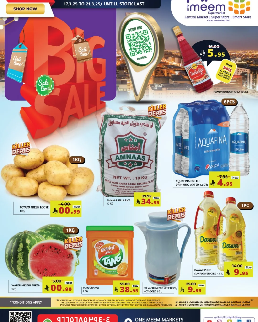 تشمل تخفيضات وان ميم اليوم الاحد 18-5-2025 مجموعة واسعة من السلع الغذائية اليومية مثل الأرز والفواكه الطازجة والمياه المعبأة والعصائر بالإضافة إلى منتجات زيت الطعام والأدوات المنزلية حيث تجد عبوات الأرز كبيرة الحجم بجودة عالية إلى جانب البطاطس والبطيخ الطازج وعصير تانج المفضل لدى الكثيرين