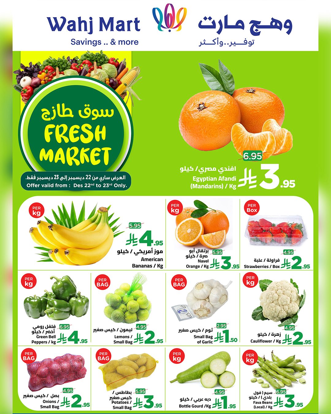 عروض وهج مارت الطازج الاثنين 2 رجب 1447هـ و تحتوي علي اللحم البقري المفروم ولحم الغنم المفروم وقطع الريش والظهر والرقبة إضافة إلى العجل بدون عظم والقطع المشكلة بالاضافة الي مجموعة من منتجات الألبان والأجبان والمخللات إلى جانب تشكيلة واسعة من الخضروات والفواكه مثل المندرين والموز والبرتقال .