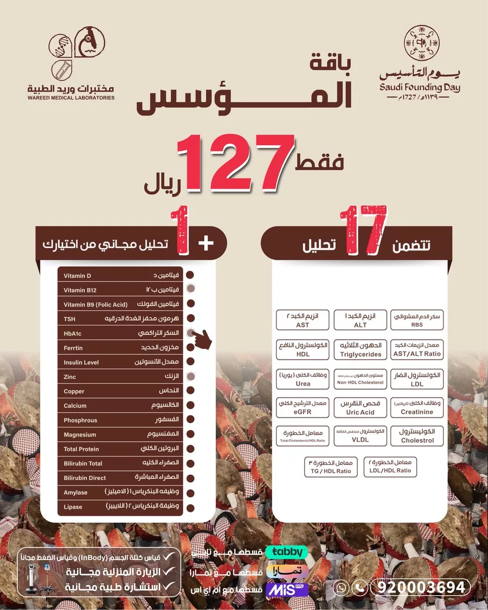 تُعد الرعاية الصحية من أهم الأولويات التي يسعى الجميع إلى تحقيقها، ومع تطور التكنولوجيا والخدمات الطبية، أصبح بإمكان الأفراد الحصول على فحوصات دقيقة وموثوقة بسهولة. في هذا السياق، تقدم مختبرات وريد الطبية عرضًا مميزًا بمناسبة يوم التأسيس السعودي، حيث توفر العديد من الباقات المتنوعة التى تناسب الجميع التي تجمع بين الجودة والدقة في التشخيص، وبأسعار تنافسية تتيح للجميع فرصة الاطمئنان على صحتهم.