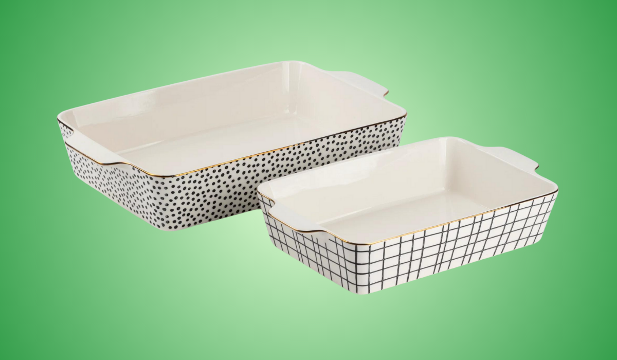 مناسبة أيضًا للخبز والتقديم، مجموعة أدوات خبز Walmart هذه تحتوي على طبق كبير بسعة 3.6 لتر بتصميم منقط وطبق متوسط بسعة 2 لتر بنمط متقاطع. يتمتع كلاهما بزخرفة ذهبية أنيقة لإضفاء لمسة فاخرة – فقط كن مستعدًا لاستقبال الكثير من الإطراء من ضيوف حفل العشاء عندما تضعهم على الطاولة.