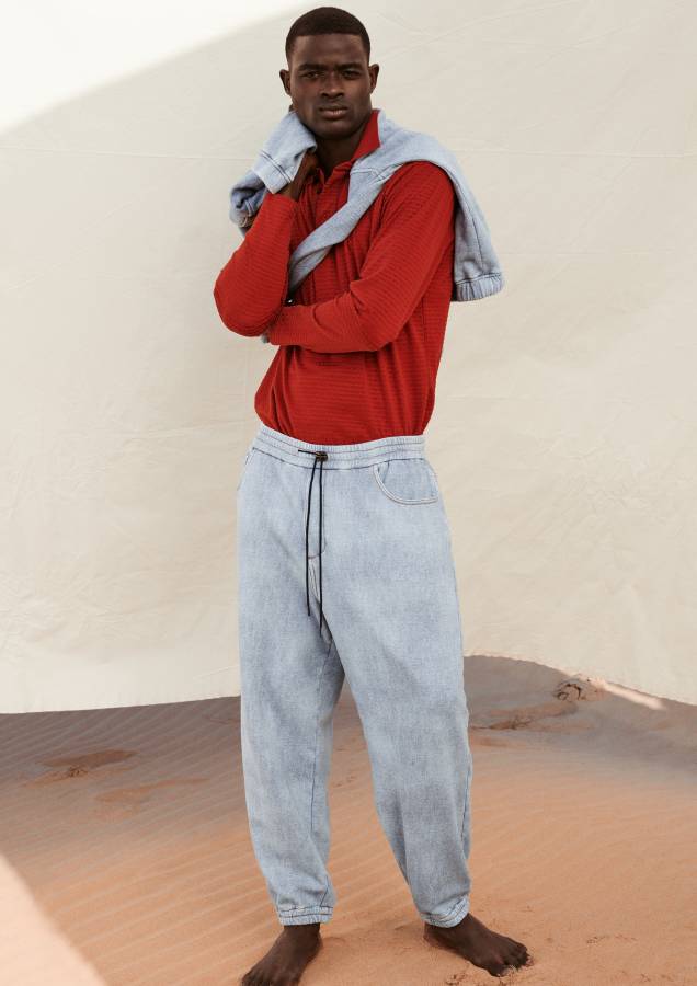 بالنسبة الى الرجال، تتضمن التشكيلة سترات ذات قصّات حادة وألوان داكنة، سويتشيرت، سراويل وسترات قصيرة مقرونة بـ “شورتات” برمودا من قطن الجيرسيه بتأثير الدنيم واسعة الساقين ذات رباط تضييق، وبدلات من الدنيم الأزرق الفاتح جداً، إضافة الى قمصان وسراويل مدبّبة من الجلد المصقول بالألوان.