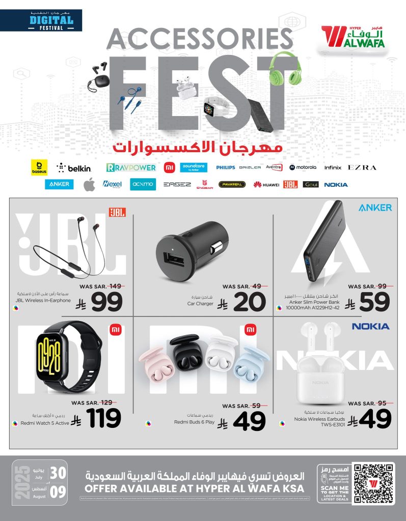 تقدم هايبر الوفاء بالرياض مهرجان الإكسسوارات الرقمية بباقة متنوعة من السماعات والساعات الذكية والشواحن من ماركات معروفة من شاومي وإنفينيكس وبريزلر بالإضافة إلى سماعات حول الرقبة من أنكر و توفر ايضا خيارات متعددة منها شاشات أموليد وساعات مقاومة للماء وموديلات مميزة من إنفينيكس وأوتو وبيجي بأسعار تنافسية