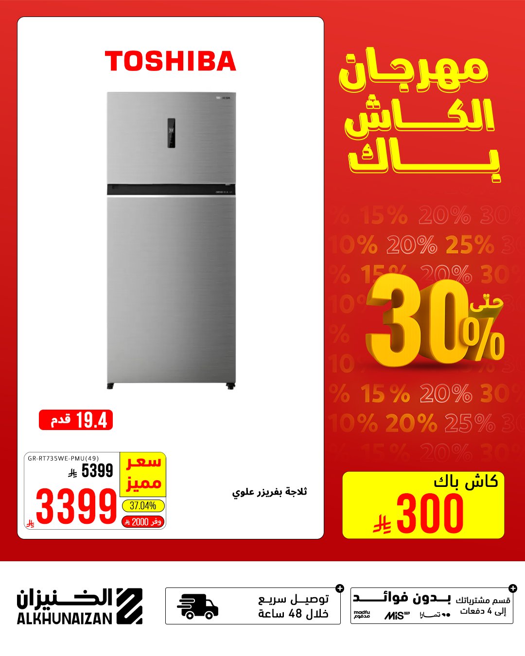 عروض مهرجان الكاش باك من الخنيزان يتميز هذا المهرجان بتخفيضات ضخمة تصل إلى 30% على مجموعة واسعة من الأجهزة الكهربائية التي تلبي احتياجات كل منزل سعودي يتضمن العرض مجموعة مختارة من أشهر العلامات التجارية مثل LG، TOSHIBA، TCL وDORA لا تفوتوا فرصه التوفير مع كاش باك الخنيزان