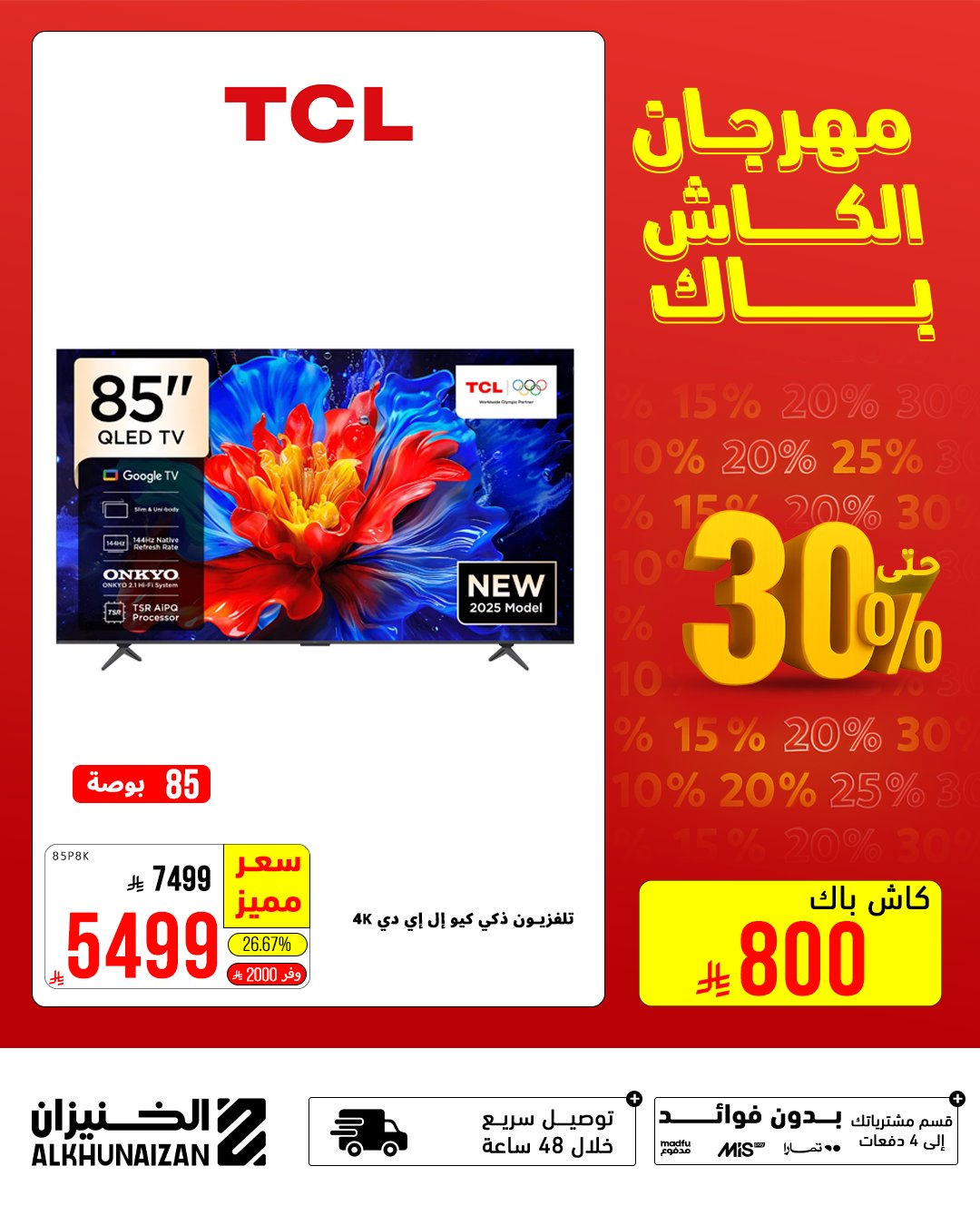عروض الخنيزان في مهرجان الكاش تقدم تخفيضات حقيقية وكاش باك يصل إلى 800 ريال على مجموعة مختارة من الأجهزة من أبرز الماركات العالمية مثل TCL وMidea وFrigidaire وذلك حتى 9 أغسطس 2025 كما يتميز العرض بتوفير سريع خلال 48 ساعة وخدمة تقسيط ميسرة دون فوائد عبر أربع دفعات لا تفوتوا افضل العروض