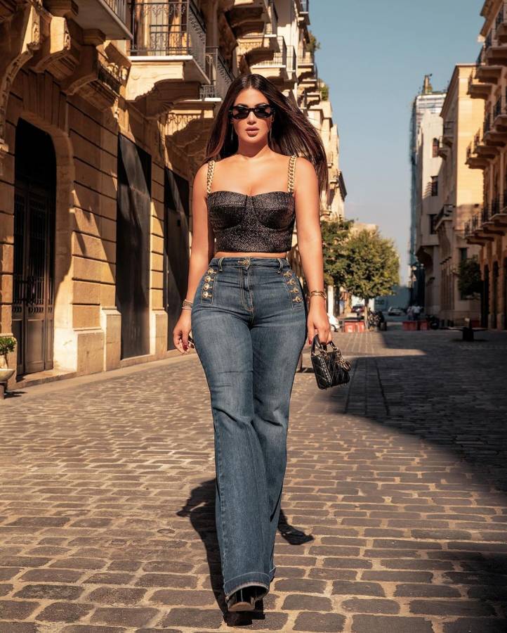 واختارت النجمة المصرية إطلالة ناعمة عبارة عن بنطال من الدنيم بصيحة الأزرار على الجانبين من دار ELISABETTA FRANCHI، يصل سعره إلى 390 يورو، مع توب أسود من الجلد مكشوف البطن يبلغ سعره 350 يورو، تميّز بتصميمه اللافت عند الصدر مع حمّالات على شكل سلسلة عريضة من اللون الذهبي.