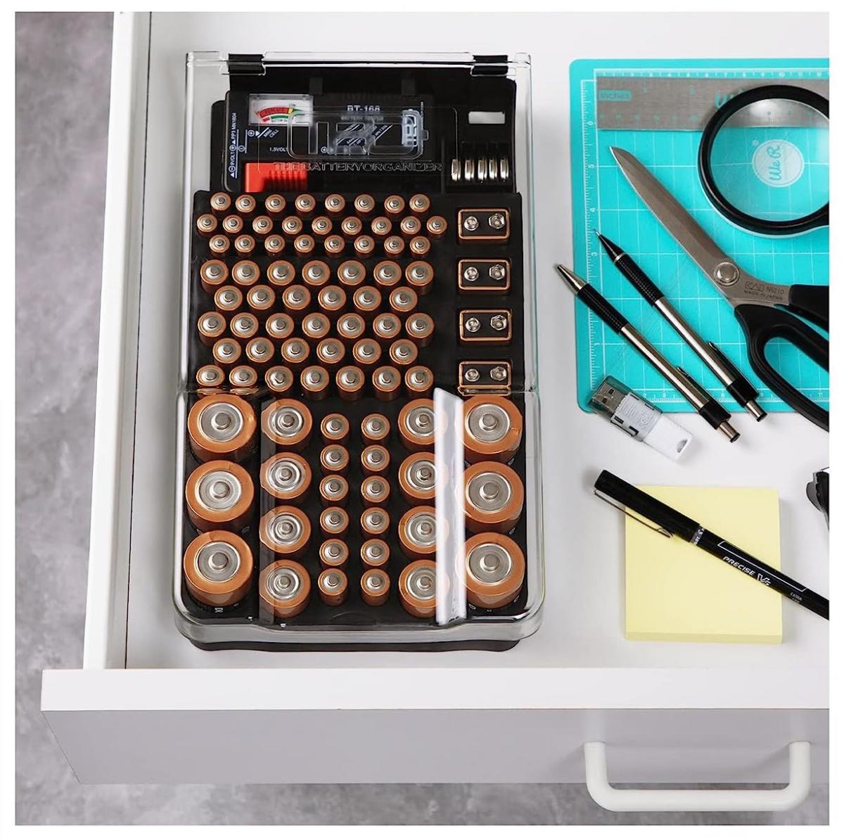جارور المهملات؟ ما درج غير المرغوب فيه؟ تخزن هذه الحاوية الشفافة ما يصل إلى 93 بطارية، ويضمن جهاز الاختبار القابل للإزالة أنك لا تمسك ببطارية فارغة.
