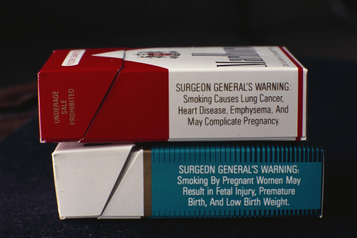 تتعلق معظم الأبحاث حول الملصقات التحذيرية بالسجائر. تعتبر المحاولة المتعددة الجوانب لخفض معدلات التدخين وحماية الناس من الأمراض التي يسببها التدخين ناجحة على نطاق واسع. تضمنت هذه التكتيكات لوائح بشأن الإعلانات، وقيودًا على الأماكن التي يُسمح فيها بالتدخين وارتفاع الأسعار، بالإضافة إلى ملصق تحذير الجراح العام الذي يحذر من أن التدخين يسبب السرطان وأمراض القلب، وهو ما كان مطلوبًا بموجب القانون الذي بدأ في عام 1965.