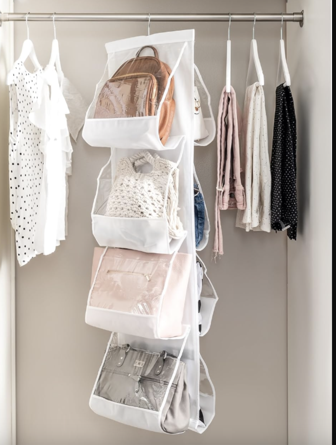 “إنها طريقة جذابة وعملية لتخزين حقائبي العديدة. أحب أن أتمكن من رؤية مكان كل شيء بسهولة.” كتب أحد مراجعي أمازون المنظمين حديثًا مع أكثر من 25 محفظة. “لقد تمكنت أيضًا من تخزين 2-3 أكياس صغيرة في نفس الفتحة.”