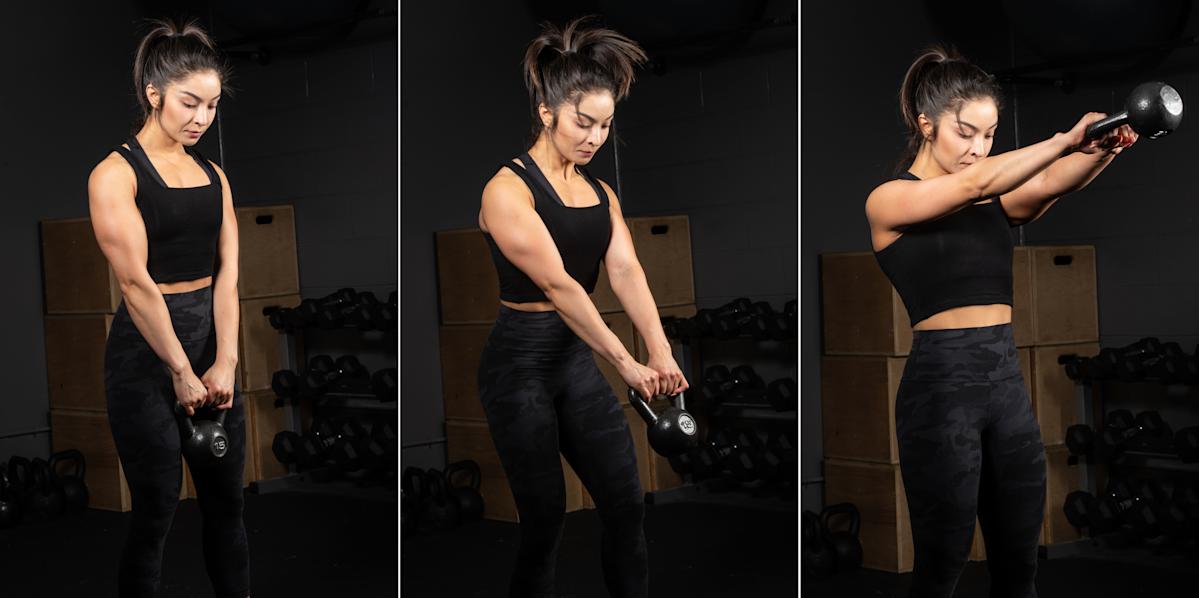 وأضاف Reznik أنها “حركة قوة” ، لأنك تولد زخماً من الجزء السفلي من الجسم – أوتار الركبة ، والكواد ، والوركان ، والثباتات الورك – و “استخدام هذا الزخم لتأرجح kettlebell لأعلى.”