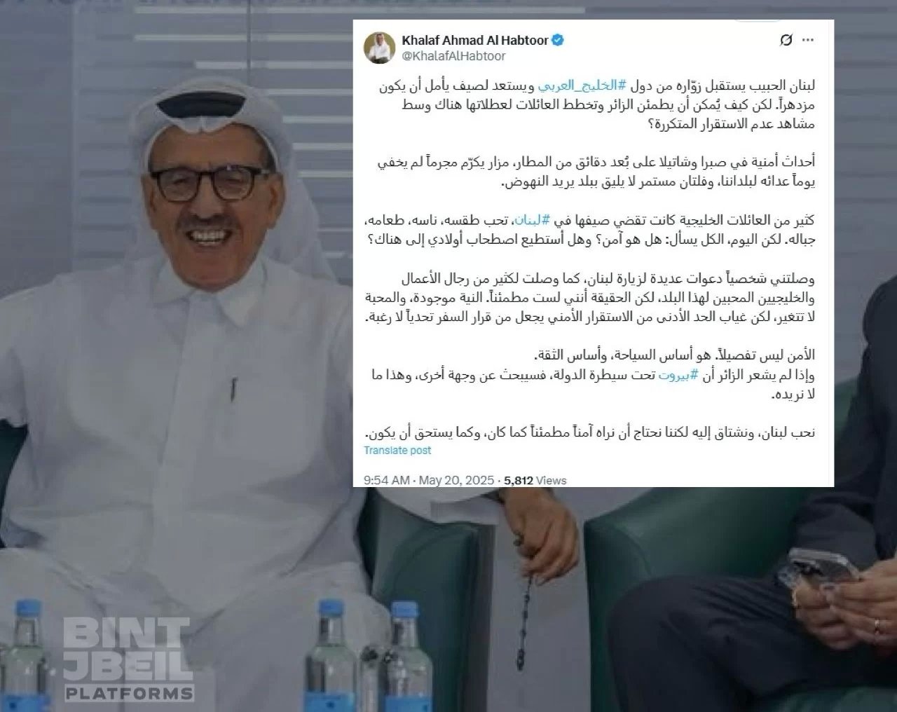 مع بدء موسم الصيف والسياحة، صرّح الملياردير خلف الحبتور عن لبنان ولكن هذه المرة بصفة “خبير أمني”، حيث قام بتوزيع تقييماته الأمنية ودسّ الدعاية السلبية والسوداوية.. لا يكفّ الحبتور عن إظهار نفسه كمحبٍّ وفيٍّ للبنان ولكنه لا يتردد في نشر الدعاية السيئة على عكس دولة الإمارات التي دعت مواطنيها إلى زيارة لبنان مؤخراً.