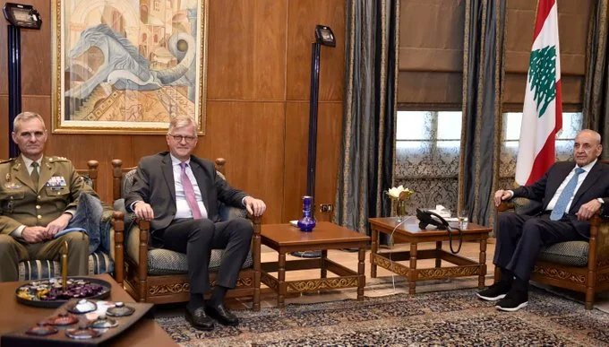 وأكد الرئيس بري “تمسك لبنان بالشرعية الدولية من خلال إستمرار قوة “اليونيفل” العاملة في جنوب لبنان وأهمية دورها في مستقبل لبنان وأمنه وإستقراره وإستقرار المنطقة ، ودور هذه القوة في رعاية إتفاق الإطار المتصل بالحدود البحرية كما إتفاق وقف النار الأخير الذي تواصل اسرائيل خرقه يوميا وتستمر في إحتلالها لأجزاء من الاراضي اللبنانية في الجنوب” .