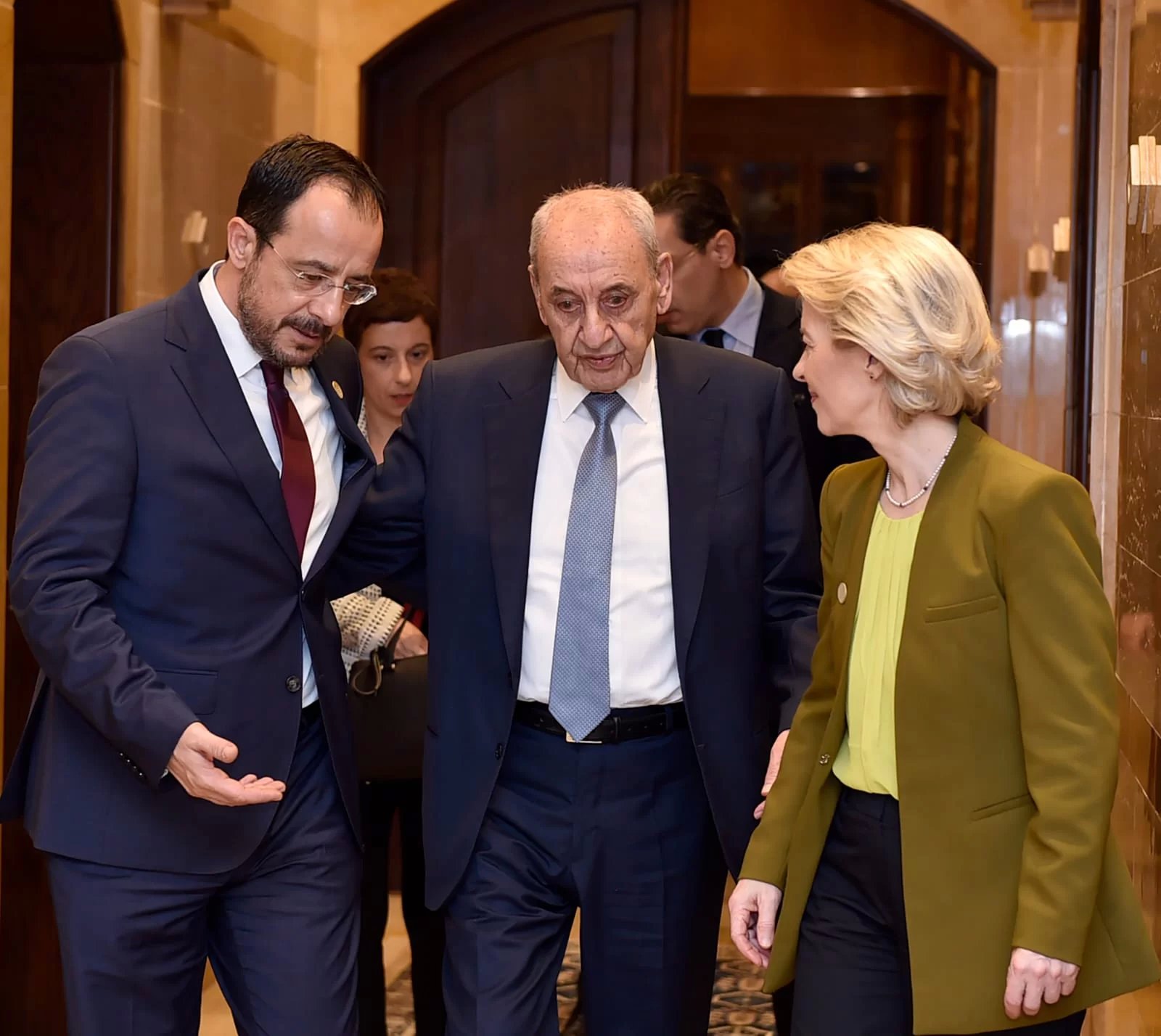 استقبل رئيس مجلس النواب نبيه بري في مقر الرئاسة الثانية في عين التينة رئيسة المفوضية الأوروبية أورسولا فونديرلاين ورئيس جمهورية قبرص نيكوس خريستودوليدس والوفد المرافق لهما، في حضور وزير الخارجية القبرصي كوستنيانوس كومبوس، سفيرة قبرص لدى لبنان ماريا تيودوسيو، سفيرة الاتحاد الاوروبي في لبنان ساندرا دو وال، رئيس لجنة الشؤون الخارجية والمغتربين النائب فادي علامة، سفير لبنان لدى بلجيكا فادي الحاج علي.