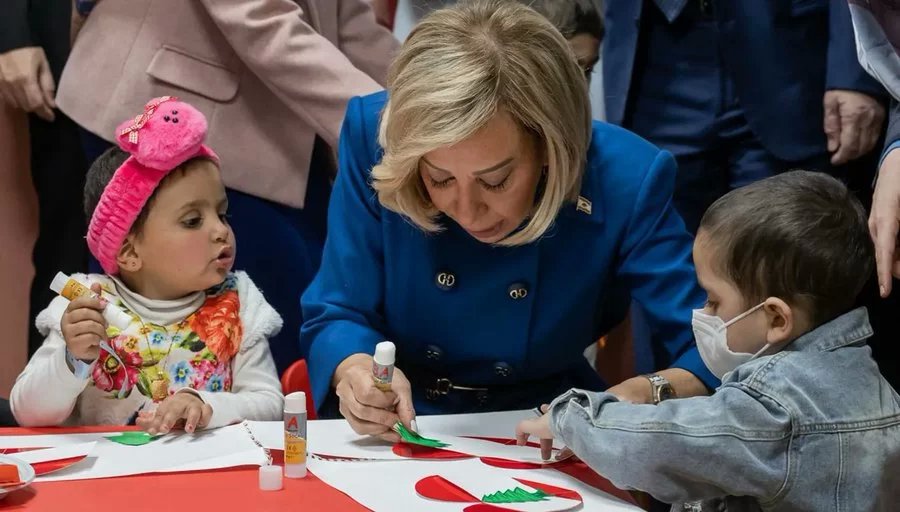 وشاركت اللبنانية الاولى الاطفال نشاطاتهم الترفيهية الفنية، في غرفة الأعمال اليدوية والفنية في المركز عبر رسم العلم اللبناني، في مبادرة تهدف إلى تحفيز الإبداع وبث الأمل في نفوسهم .