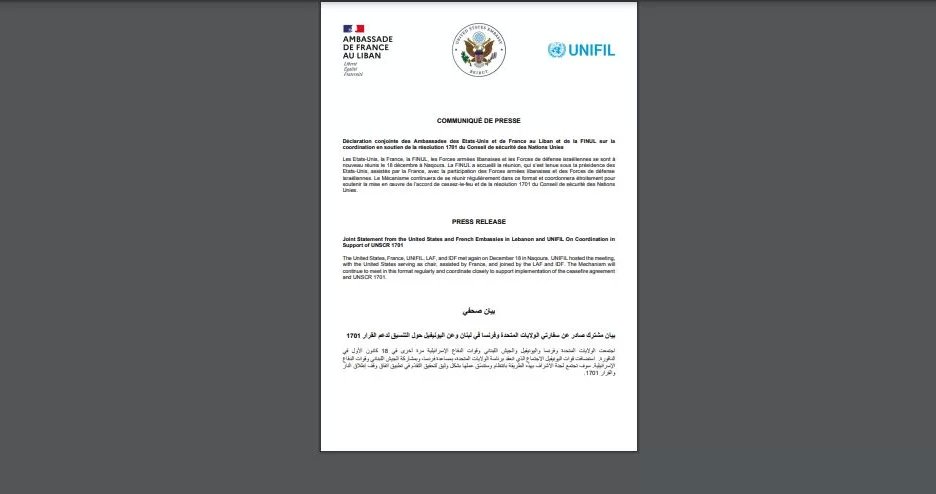 صدر عن سفارتي الولايات المتحدة وفرنسا في لبنان وعن “اليونيفيل”، بيان مشترك حول التنسيق لدعم القرار 1701، وفيه :”اجتمعت الولايات المتحدة وفرنسا و”اليونيفيل” والجيش اللبناني وقوات الدفاع الإسرائيلية مرة أخرى في 18 كانون الأول في الناقورة.استضافت قوات اليونيفيل الاجتماع الذي انعقد برئاسة الولايات المتحدة، بمساعدة فرنسا، وبمشاركة الجيش اللبناني وقوات الدفاع الإسرائيلية. سوف تجتمع لجنة الاشراف بهذه الطريقة بانتظام وستنسق عملها بشكل وثيق لتحقيق التقدم في تطبيق اتفاق وقف إطلاق النار والقرار 1701″.