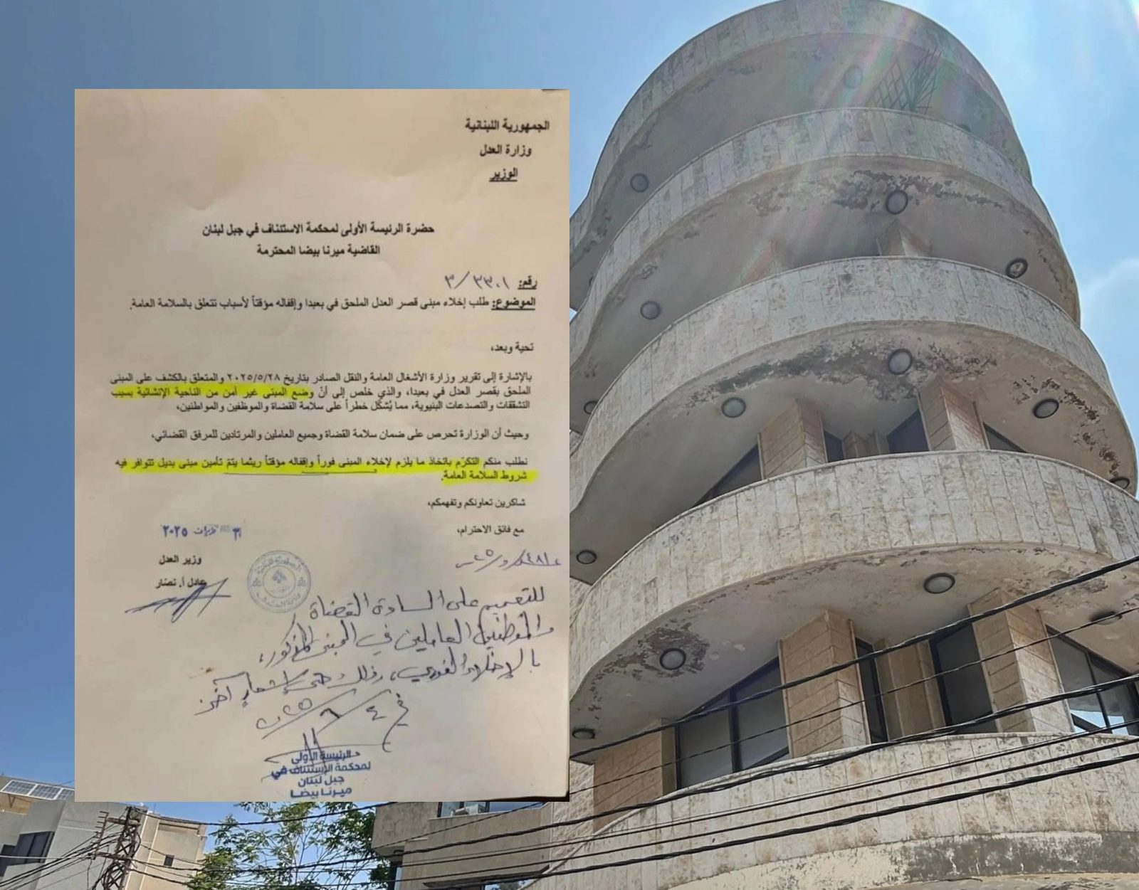 طلب وزير العدل عادل نصّار من القاضية ميرنا بيضا إخلاء قصر العدل الملحق في بعبدا فوراً وإقفاله مؤقتاً، بعد تقرير لوزارة الأشغال أكد أن المبنى غير آمن إنشائياً ويشكّل خطراً على السلامة العامة.