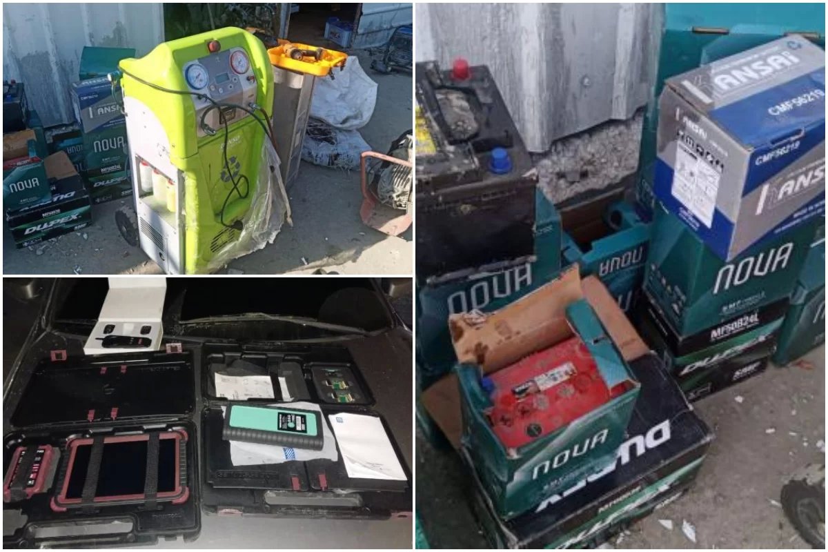 /12/ بطارية سيارة، وأداة فحص أوكسيجين للسيارات، وأداة لحام حديد، و/4/ كابلات كهرباء، وحقيبتين بداخلها جهازي “سكانر” مع المتمّمات، وآلة برمجة مفاتيح سيارات.