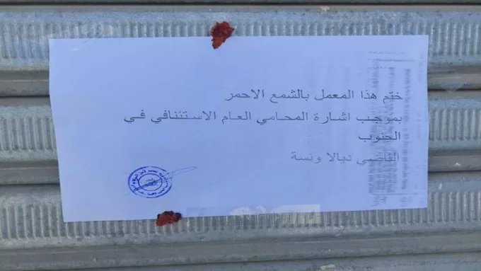 ونفذت عملية الاقفال بعد مخابرة النيابة العامة في الجنوب بشخص القاضي ديالا ونسة التي امرت بختمه بالشمع الاحمر وتلف البضاعة.