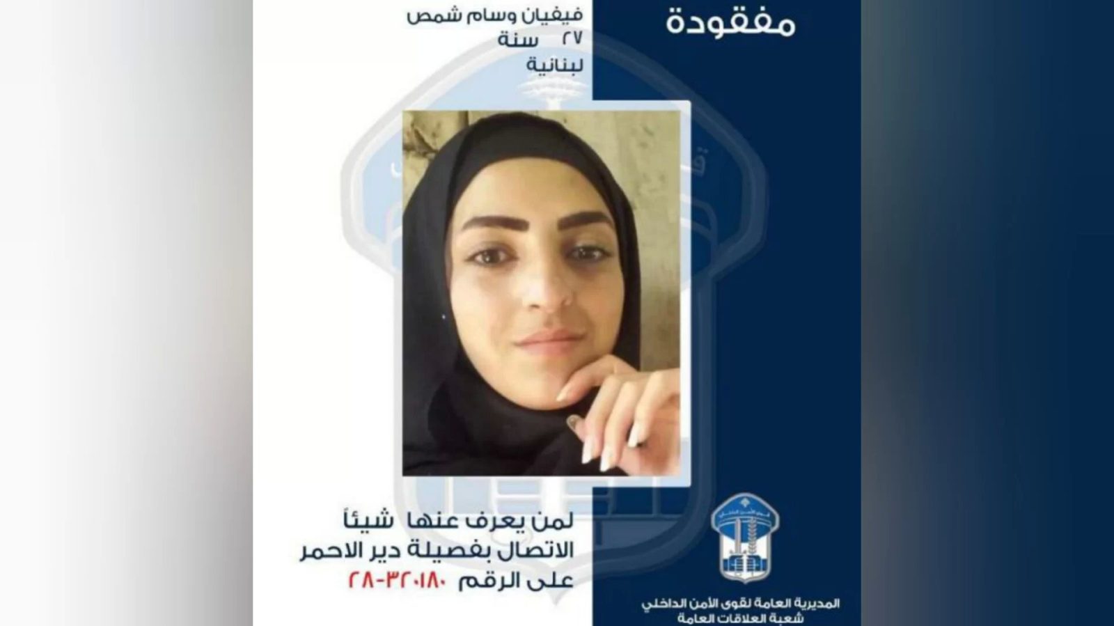 تُعمّم المديريّة العامّة لقوى الأمن الداخلي، بناءً على إشارة القضاء المختص، صورة المفقودة: