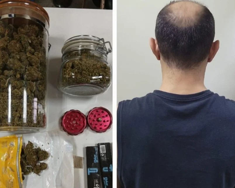 بتفتيش منزله، تم ضبط /7/ نبتات “ماريجوانا” مزروعة على الشرفة، وكميّة من المادة ذاتها مخزّنة داخل وعاءَين زجاجيَّين، وأدوات تُستَخدَم لتعاطي المخدِّرات.