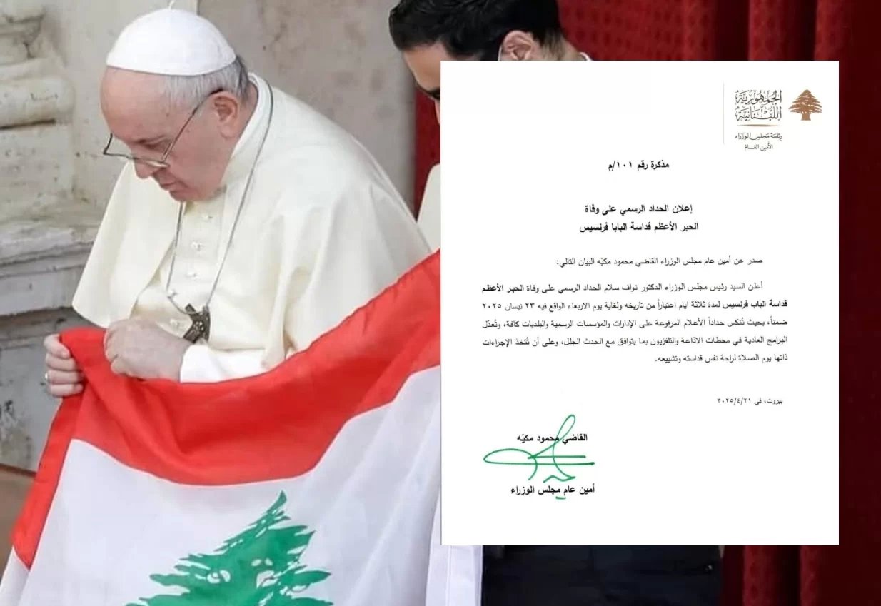 صدر عن الأمين العام لمجلس الوزراء القاضي محمود مكيه البيان التالي: “أعلن رئيس مجلس الوزراء الدكتور نواف سلام الحداد الرسمي على وفاة الحبر الأعظم قداسة البابا فرنسيس لمدة ثلاثة أيام اعتبارا من تاريخه ولغاية يوم الأربعاء الواقع فيه 23 نيسان 2025 ضمنا، بحيث تنكس الأعلام المرفوعة على الإدارات والمؤسسات الرسمية والبلديات كافة، وتعدل البرامج العادية في محطات الإذاعة والتلفزيون بما يتوافق مع الحدث الجلل، على أن تتخذ الإجراءات ذاتها يوم الصلاة لراحة نفس قداسته وتشييعه”.