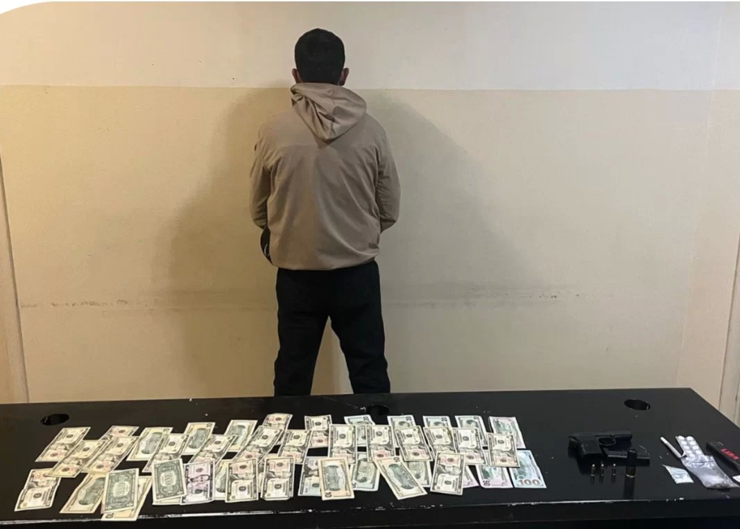 كما ضبط بحوزته سلاح حربي ومواد مخدرة ومبالغ مالية.