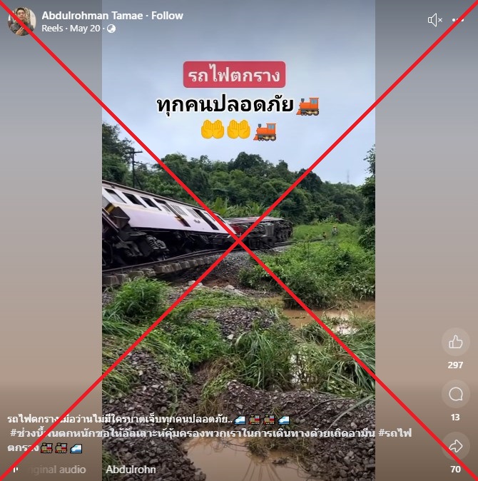 “لقد خرج القطار من القضبان أمس. لم يصب أحد. الجميع آمن” ، يقول وصف اللغة التايلاندية إلى بكرة فيسبوك المنشورة في 20 مايو 2025.