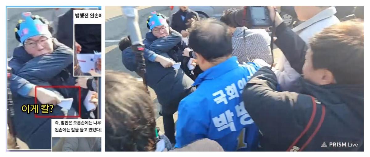 الصورة الموجودة على الجانب الأيسر من الصورة المجمعة كانت لقطة شاشة مأخوذة من 1:01:10 علامة لقطات البث المباشر للهجوم على YouTube والتي التقطتها قناة Jeong Yang-il TV، وهي قناة يديرها أحد أنصار لي (الرابط المؤرشف).