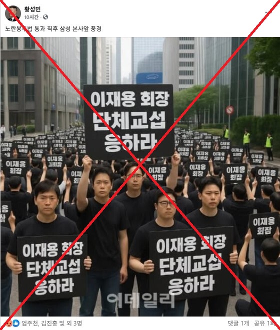 قبل المقطع المتوقع من التشريعات في كوريا الجنوبية التي من شأنها أن توسع حماية العمل ، تمت مشاركة صورة تم إنشاؤها في الذكاء الاصطناعى في المنشورات بدعوى زوراً أنها أظهرت العمال المذهلين خارج مقر شركة Samsung العملاقة للتكنولوجيا. نشأت الصورة من تقرير إخباري ، حيث تم تعليقها على أنها تم إنشاؤها بواسطة ChatGPT ، مما يوضح سيناريو افتراضي بمجرد تمرير تعديلات على قانون تعديل العلاقات العمالية وعلاقات العمل.