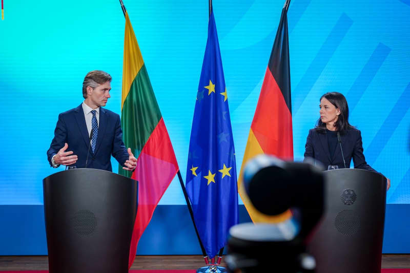 وزيرة الخارجية الألمانية أنالينا بيربوك (إلى اليمين) ووزير خارجية ليتوانيا كيستوتيس بودريس يتحدثان خلال مؤتمر صحفي في وزارة الخارجية الألمانية. كاي نيتفيلد/ وكالة الأنباء الألمانية
