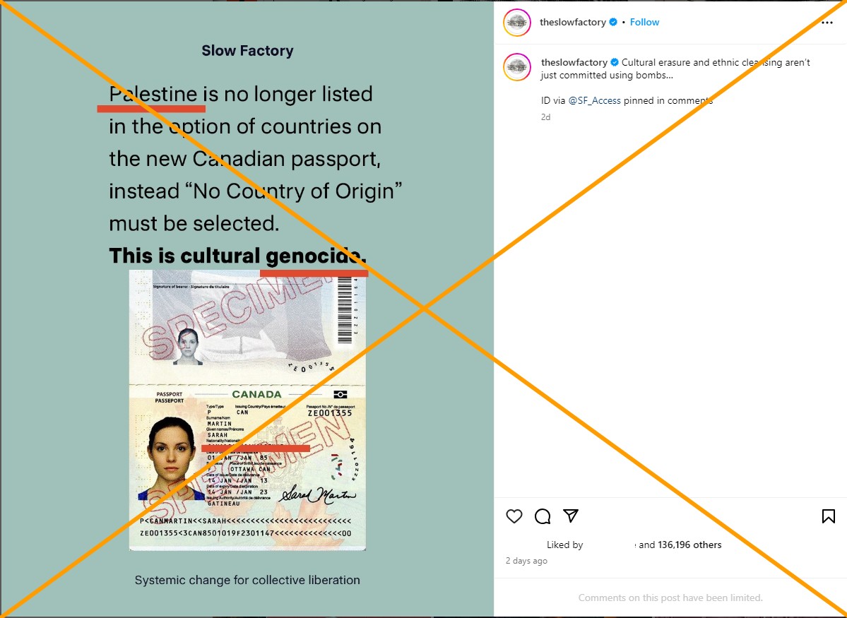 يقول النص الموجود في صورة على موقع إنستغرام بتاريخ 28 فبراير/شباط 2024: “لم تعد فلسطين مدرجة في خيار الدول في جواز السفر الكندي الجديد، وبدلاً من ذلك يجب تحديد “لا يوجد بلد منشأ”.