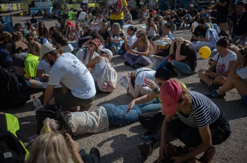 يجلس الناس على الأرض ويغطيون رؤوسهم عندما يبدو صفارات الإنذار تحذيرًا من صاروخ وارد أطلقه من اليمن خلال احتجاج يدعو إلى إنهاء الحرب على غزة وتحرير الرهائن. ilia yefimovich/dpa