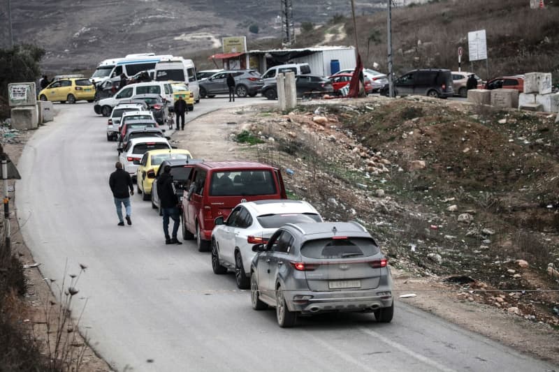 فلسطينيون ينتظرون على حاجز جنوب مدينة نابلس بالضفة الغربية، بعد أن أغلقت قوات الاحتلال الإسرائيلي جميع الحواجز في أعقاب هجوم إطلاق نار على حافلة إسرائيلية عند مفترق طرق بالقرب من مستوطنة أرييل اليهودية، مما أدى إلى إصابة عدد من المستوطنين اليهود. ناصر اشتية / صور SOPA عبر ZUMA Press Wire / dpa