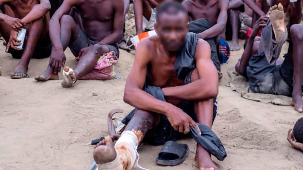 وفي صورة أخرى، تظهر عشرات الرجال، ويبدو عليهم جميعًا سوء التغذية، وكان أحد هؤلاء في المقدمة مصابًا بجرح مفتوح.