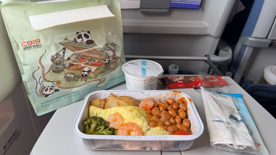 تقدم شركة طيران الصين وجبات ساخنة في الدرجة الاقتصادية خلال ساعات تناول الوجبات حتى للرحلات القصيرة (مدة الرحلة اليوم: ساعة و40 دقيقة). تم وضع المياه المعبأة في كل حقيبة موجودة في ظهر المقعد قبل الصعود إلى الطائرة، وكان مذاق العجة – إلى جانب الزبادي وقطعة الشوكولاتة – رائعًا تمامًا.