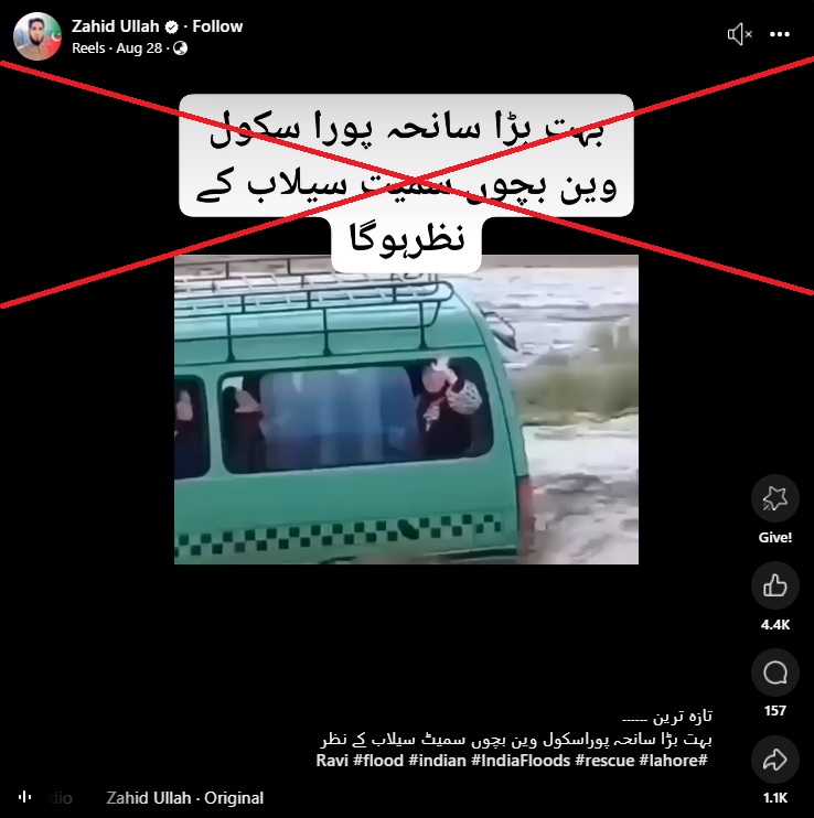 “الأحدث: مأساة ضخمة. أصبحت سيارة المدرسة بأكملها مع الأطفال ضحية للفيضانات” ، كما يقرأ التسمية التوضيحية باللغة الأردية لبكر فيسبوك نُشر في 28 أغسطس.