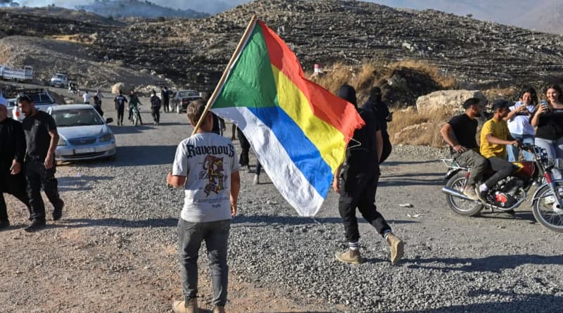 يبحث سكان الدروز بالقرب من السياج الحدودي الإسرائيلي السوري بالتضامن مع مجتمعهم في سوريا ، في ماجدال شمس ، 16 يوليو 2025 (الائتمان: مايكل جيلادي/فلاش 90)