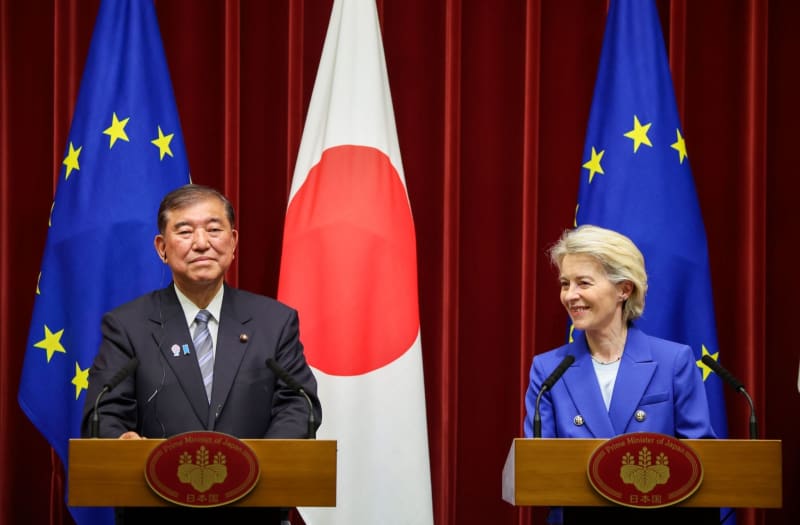 (LR) يحضر رئيس المجلس الأوروبي أنطونيو كوستا ورئيس الوزراء الياباني إيشيبا شيجرو ورئيس المفوضية الأوروبية أورسولا فون دير لين في مؤتمر صحفي بعد اجتماعهم في مكتب رئيس الوزراء. كريستوف ليكوب/المفوضية الأوروبية/DPA