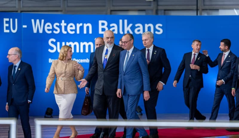المستشار الألماني فريدريش ميرز ينضم إلى رئيس وزراء ألبانيا إيدي راما، ورئيس ليتوانيا جيتاناس نوسيدا، ورئيس وزراء السويد أولف كريسترسون، وممثلة السياسة الخارجية بالاتحاد الأوروبي كاجا كالاس في صورة عائلية في قمة الاتحاد الأوروبي وغرب البلقان. مايكل كابلر/ وكالة الأنباء الألمانية