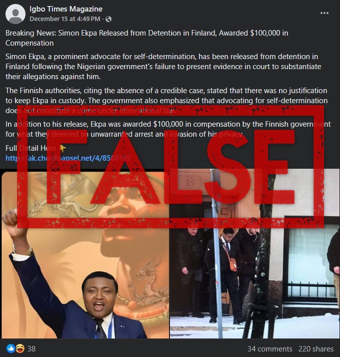 قامت الحكومة الفنلندية بسجن الزعيم النيجيري الانفصالي سيمون إيكبا في نوفمبر 2024 بعد اعتقاله للاشتباه في قيامه بأنشطة إرهابية والتحريض على العنف في نيجيريا. ومنذ ذلك الحين، زعمت عشرات الحسابات على فيسبوك أنه تم إطلاق سراح إيكبا من الاحتجاز. ولكن هذا غير صحيح. وقال مكتب التحقيقات الوطني الفنلندي لوكالة فرانس برس Fact Check إن إيكبا لا يزال رهن الاحتجاز في انتظار المحاكمة. وأمام المدعين مهلة حتى مايو 2025 لإضفاء الطابع الرسمي على التهم الموجهة إليه.