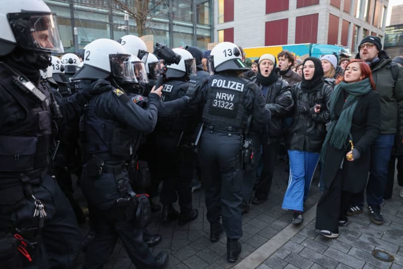 يدفع ضباط الشرطة المتظاهرين للسماح لفيدريتش ميرز ، رئيس الاتحاد المسيحي الديمقراطي في ألمانيا (CDU) ومرشح المستشار ، بمغادرة المستشفى الجامعي في كولونيا. أوليفر بيرج/DPA