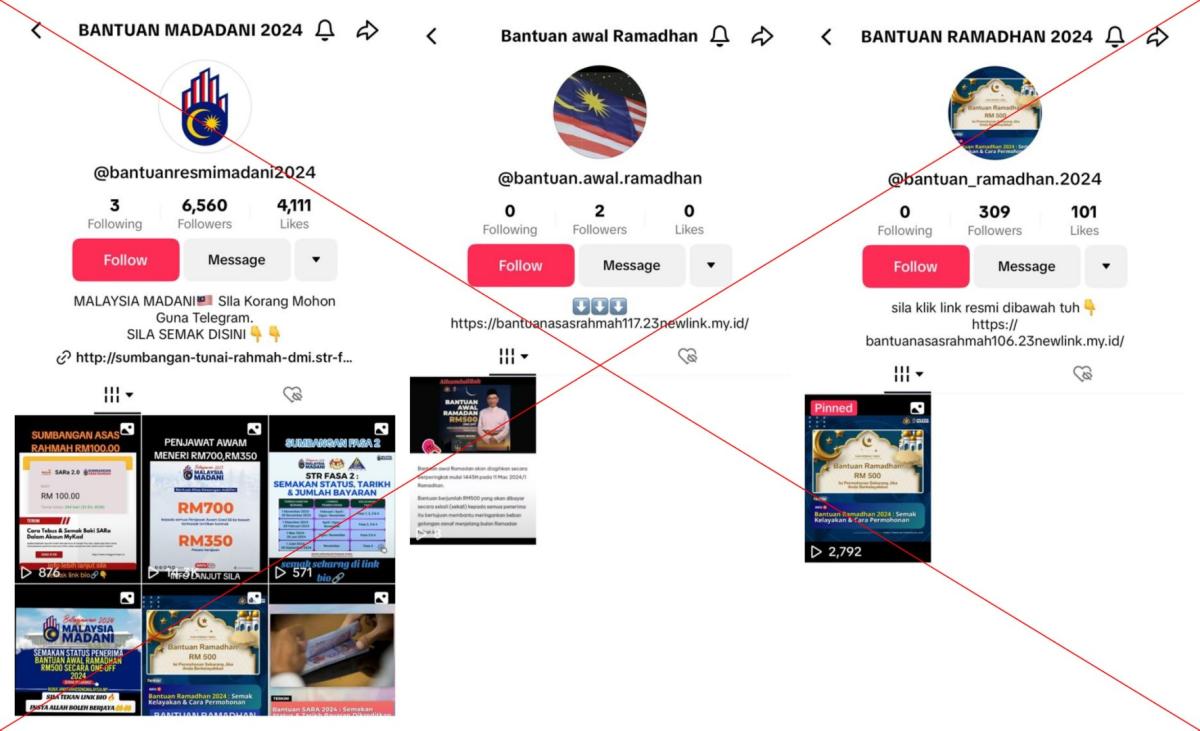 وبالمثل، فإن حسابات TikTok التي تروج للصرف النقدي الرمضاني في عام 2024 ليست تابعة للحكومة الماليزية.