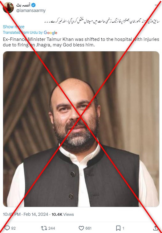 “تم نقل وزير المالية السابق تيمور خان إلى المستشفى إصابات نتيجة هجوم مسلح. مايو جod Bless”، هذا ما جاء في منشور X تمت مشاركته في 14 فبراير بواسطة حساب يضم أكثر من 200000 متابع.