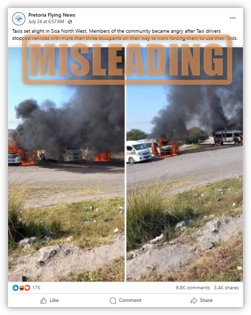 تعتبر أجهزة العنف المرتبطة بالسيارات في جنوب إفريقيا شائعة وعادة ما تكون مميتة. بدأت صور سيارات الأجرة الصغيرة في المقاطعة الشمالية الغربية في الانتشار على وسائل التواصل الاجتماعي في يوليو ، لكن السياق مضلل ؛ تم التقاط الصور في عام 2022 بعد أن اشتبك أفراد المجتمع مع سائقي سيارات الأجرة ووضع سياراتهم على النار. منذ ذلك الحين ، تستمر الصور في الظهور خارج السياق.