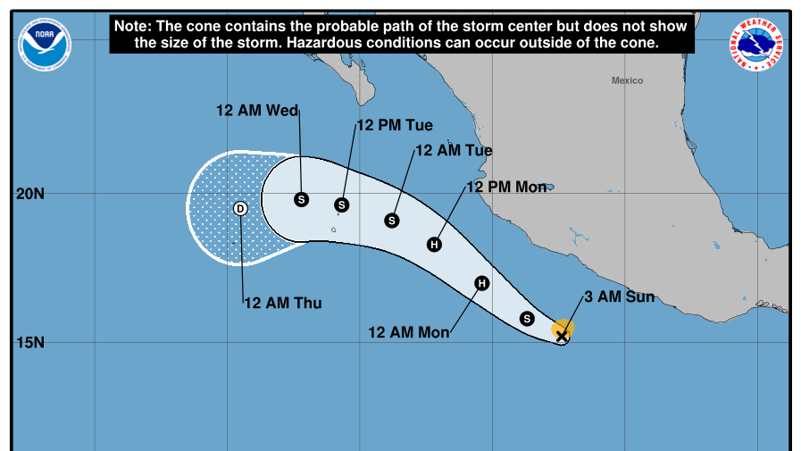 في الساعة الرابعة صباحًا ، كان المركز يقع في شرق المحيط الهادئ ، ويتحرك غربًا شمال غرب على بعد 12 ميلًا في الساعة. العاصفة لديها أقصى قدر من الرياح المستدامة 45 ميلا في الساعة ، مع عواصف أعلى.