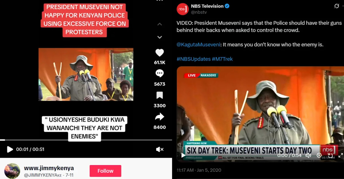 تميزت احتجاجات كينيا المؤيدة للديمقراطية الأخيرة بالعنف والنهب وتدمير الممتلكات. رداً على ذلك ، طلب الرئيس ويليام روتو للشرطة إطلاق النار على المخربين في الساقين وإحضارهم للمحاكمة ، بدلاً من قتلهم. في أعقاب هذه الأحداث ، يتم تداول مقطع فيديو على وسائل التواصل الاجتماعي مع الادعاء بأنه يظهر أن الرئيس الأوغندي يويري موسيفيني ينتقد الطريقة التي تعاملت بها الشرطة الكينية مع المتظاهرين. لكن هذا خطأ. مقطع الفيديو من رحلة Museveni التي استمرت ستة أيام في عام 2020 لإحياء ذكرى صراع التحرير عام 1986 ، وحذر خلاله قواته الأمنية من استخدام أسلحتهم على المدنيين عند إدارة الحشود.